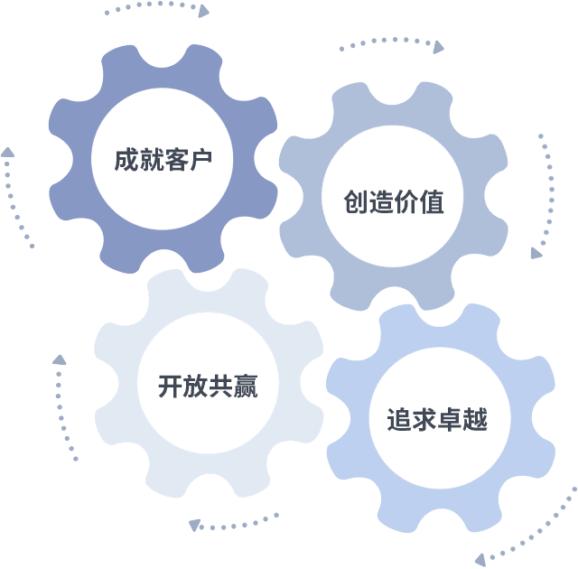 成就客户是一切决策的出发点,,创造价值是衡量所有工作的标准,,,追求卓越是我们做事做人的态度,,,,开放共赢是我们的格局也是最终的结果。。。。价值观的齿轮环环相扣,,推动着组织里的每个人不断向前。。
